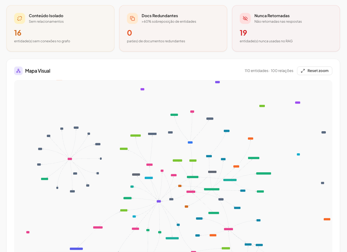 "O grafo de conhecimento revelou que 40% dos nossos documentos nunca eram usados nas respostas. Conseguimos limpar a base e melhorar a qualidade das respostas em 2 semanas."